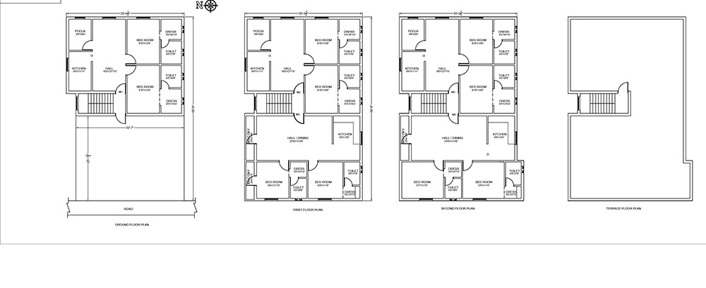 In hall, bed rooms & kitchen, regular plain colour ceramic vitrified (2' x 2') digital tiles from the make of ANUJ / KAG / SOMANY.