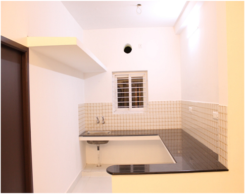 GRANITE PLATFORM with stainless steel sink. Glazed Ceramic tiles up to 2' above from the level of kitchen platform
